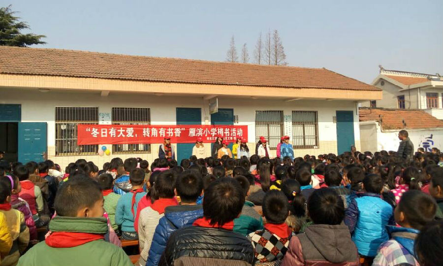 2014年12月24日h小说 情系村小社团的志愿者们来到雁滨小学,开展了“冬日存大爱·转角有书香”的志愿活动,为孩子们送去了祝福和温暖。全校学生积极参与了活动,使此次的温暖之行画上了圆满的句号。