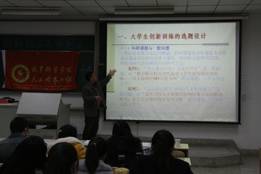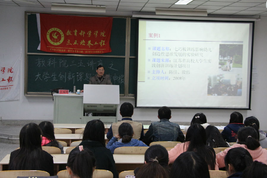 2016年4月6日下午15点20分,学院特邀南通市创造发明学会会长、h小说 创造教育研究所所长、h小说 初教系教授王灿明老师在主校区8号楼209教室作题为《大学生创新训练课题的设计与申报》的专题讲座。