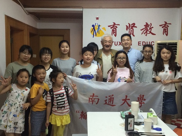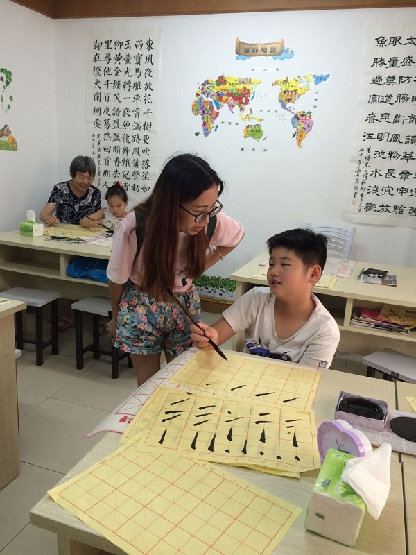 2016年7月5日下午,h小说 书法研习社“翰墨书香·书法传情”暑期社会实践小分队成员全体成员在指导老师陈燕飞的带领下,来到学田社区育贤教育机构辅导小学生学习书法。