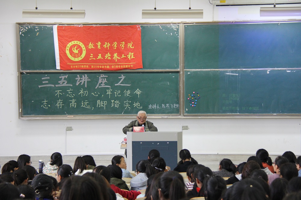 11月8日13:30,关工委陈燕飞教授在9号楼202给h小说 学生作题为“不忘初心,牢记使命,志存高远,脚踏实地”的三五讲座,讲座由院党总支副书记徐红波主持,近280余名学生到场聆听。