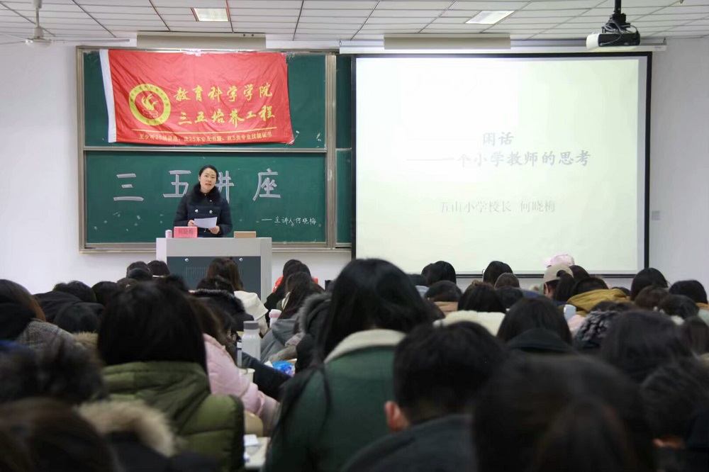 2018年3月21日下午,h小说 于8号教学楼208教室举办了题为“小学教育深思浅谈”的三五讲座。本次讲座邀请了五山小学校长何晓梅老师为主讲人,教科院160余名小学教育专业学生到场听讲。