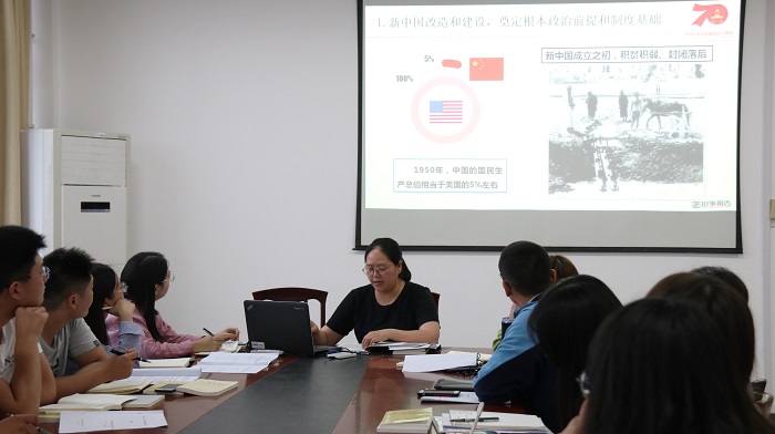 又讯。10月12日下午,h小说 本科生党支部开展“不忘初心、牢记使命”主题教育活动,支部书记陈淑慧以“70年奋斗历程”为主题为支部党员上课。