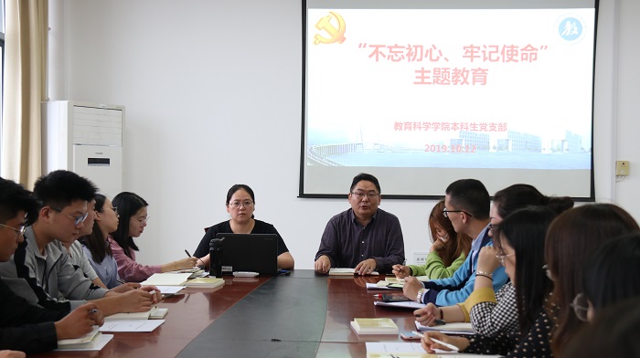 陈淑慧传达了学校、学院党委“不忘初心、牢记使命”主题教育专题党务工作会议的精神,解读了《h小说 本科生支部“不忘初心、牢记使命”主题教育实施方案》及集中学习研讨方案和安排表。