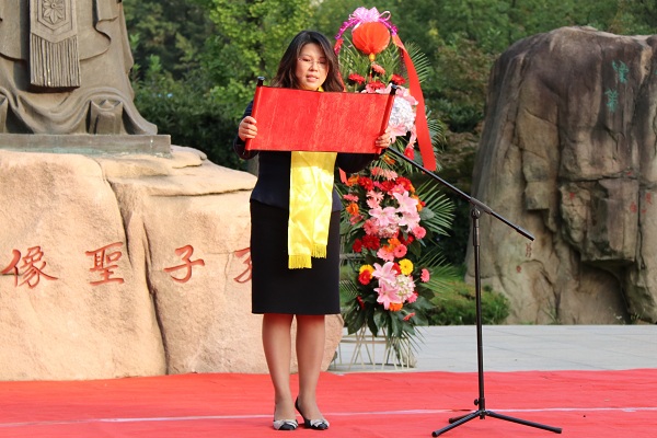 朱丹代表学院在祭孔仪式上致辞。她强调:孔子被历朝历代奉为“文圣”,他所创立的儒家文化,为中国的文化教育立下了不朽功勋。作为一个以教师教育为特色,以培养师范生为主体的学院,理应继承学校师范教育的传统,扛起“传承传统文化薪火,重塑高尚师德灵魂”的大旗。她希望2019级的师范生们谨记先圣遗训,一要学习他的仁爱情怀,用高尚的师德熏陶学生,用渊博的知识丰富学生,用高雅的言行影响学生;二要学习他的使命意识和进取精神,要自觉肩负起时代赋予我们的使命,砥砺品格,勤思善学,提高教书育人的本领,自觉投入到祖国的教育事业中去;三要学习他的学习精神和内省精神,以孔子作为人格完善的榜样,树立终身学习的意识,将国学精要与时代精神、育人事业紧密结合,提升自身道德修养,早日成长为国家的栋梁之才。