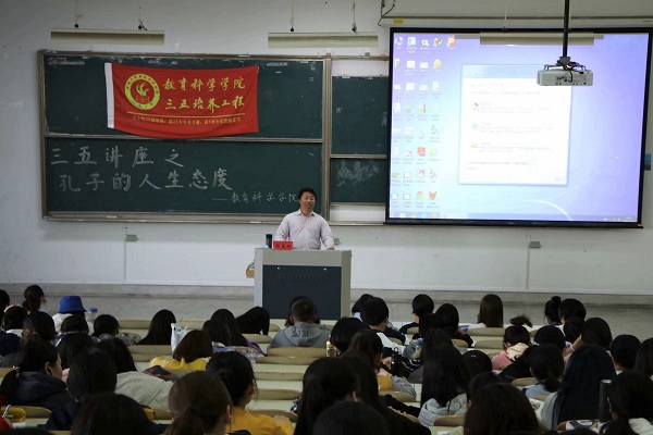 10月30日,h小说 于9号楼201教室举办了一场以“孔子的人生态度”为主题的三五讲座。此次讲座由陈春保老师主讲,教科院210余名同学到场聆听。