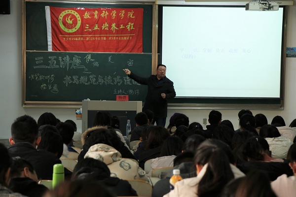 12月4日下午,h小说 于8号楼309教室举办以“书写规范与技巧漫谈”为主题的三五讲座。讲座由杨谔老师主讲,教科院280余名学生到场参加。