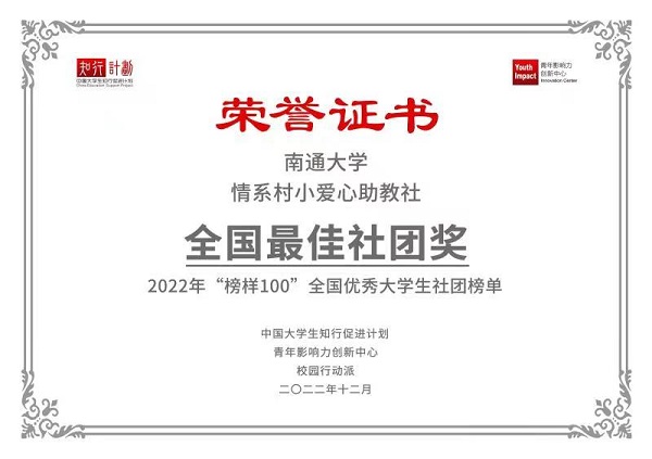 2022年“榜样100”全国优秀大学生社团榜单 正式发布。来自清华大学、北京大学、复旦大学、上海交通大学等170余所高校、590+社团/团队、360+优秀大学生上榜。h小说 “情系村小爱心助教社”和“情境教育研究会”两支社团入围榜单。