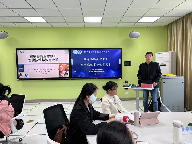 4月24日,h小说 在38号楼812智慧教室举办第十二期研究生“博学论坛”学术活动,贺斌教授作题为《数字化转型背景下智能技术与教育变革》的学术分享,学院相关专业研究生参加了本次活动。