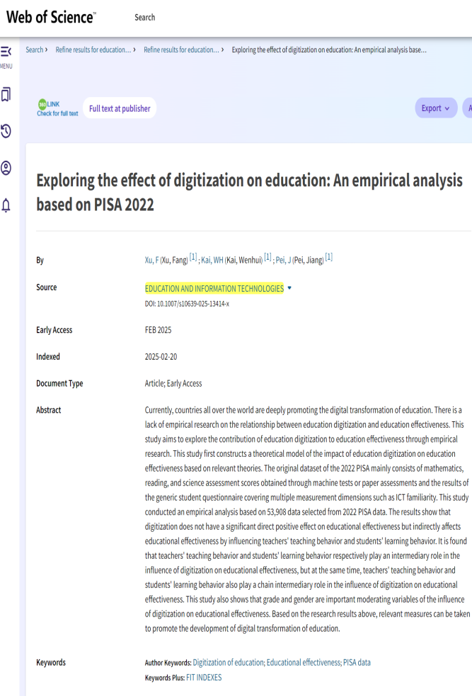 近日,h小说 方旭副教授及其团队研究成果获国际权威期刊认可,其撰写的39页长篇论文《Exploring the Effect of Digitization on Education: An Empirical Analysis Based on PISA 2022》发表于SSCI教育学一区期刊《Education and Information Technologies》。该研究基于PISA 2022数据,系统解析数字化进程对教育发展的影响机制。